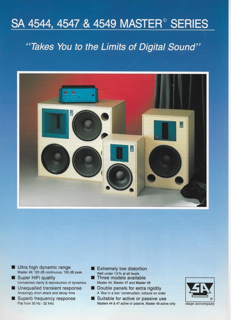 In the beginning, Stage Accompany manufactured loudspeaker cabinets (the well known "W-Bins" and "slides") and flightcases. Several years later, professional amplifiers and, the world's first programmable parametric equalizer were added to the list of equipment manufactured by Stage Accompany. In 1986, demonstrating a dedication to achieve optimal sound reproduction and a desire to ensure the first class quality present in its other products, SA made the decision to begin development and production of its own componentry. Standing at the forefront of its developments is the patented, award winning Ribbon Compact Driver. Integrating this unique mid-range/treble reproducing Ribbon Compact Driver into all of its systems, SA has achieved absolute Hi-Fi quality at unprecedented SPLs.