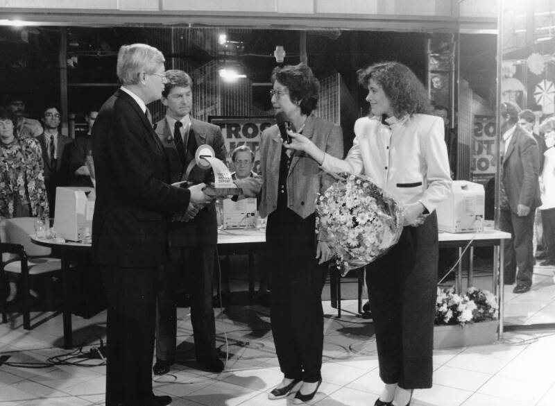 Uitreiking door Hans Wiegels aan Sonja de vrouw van Eddy Wijnker